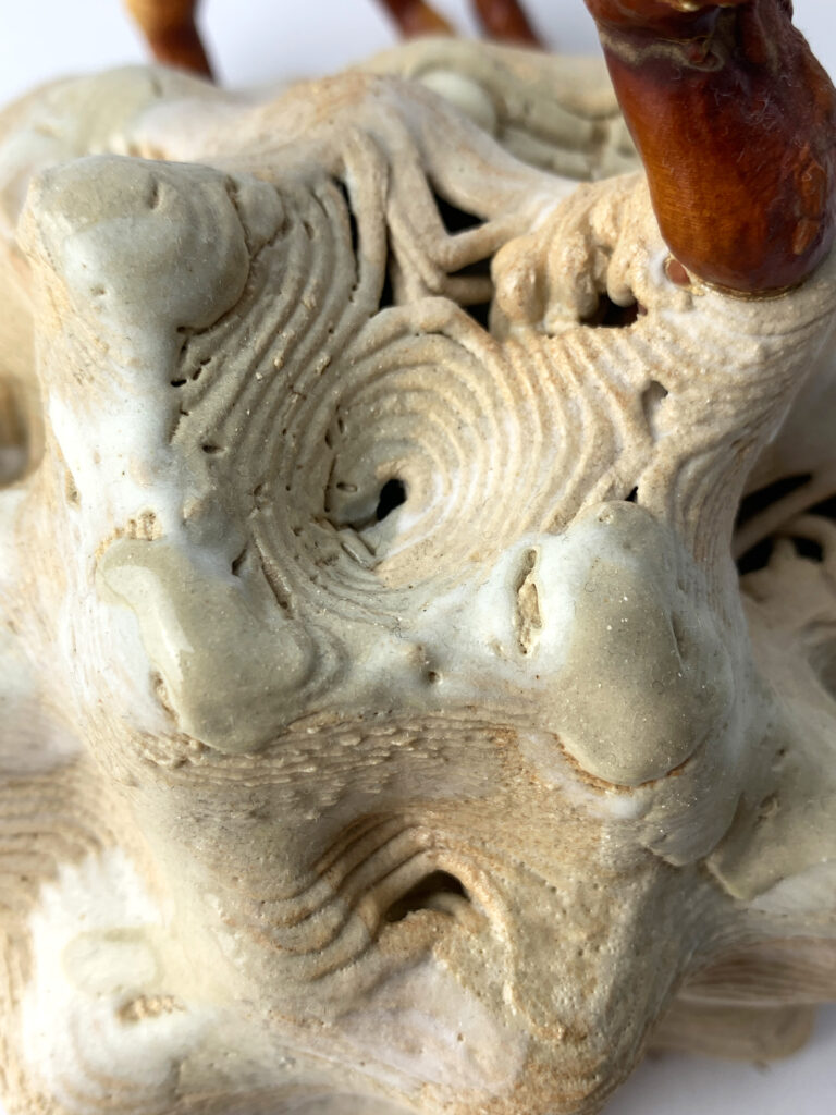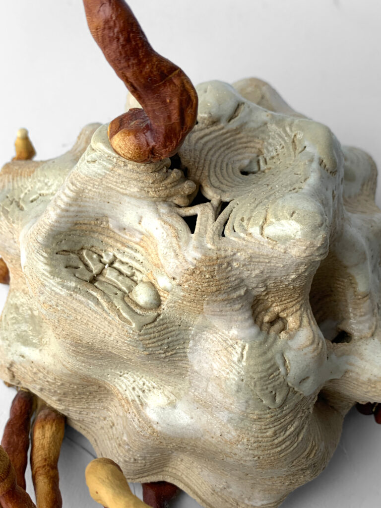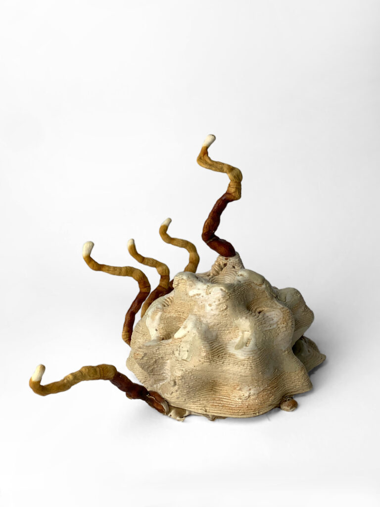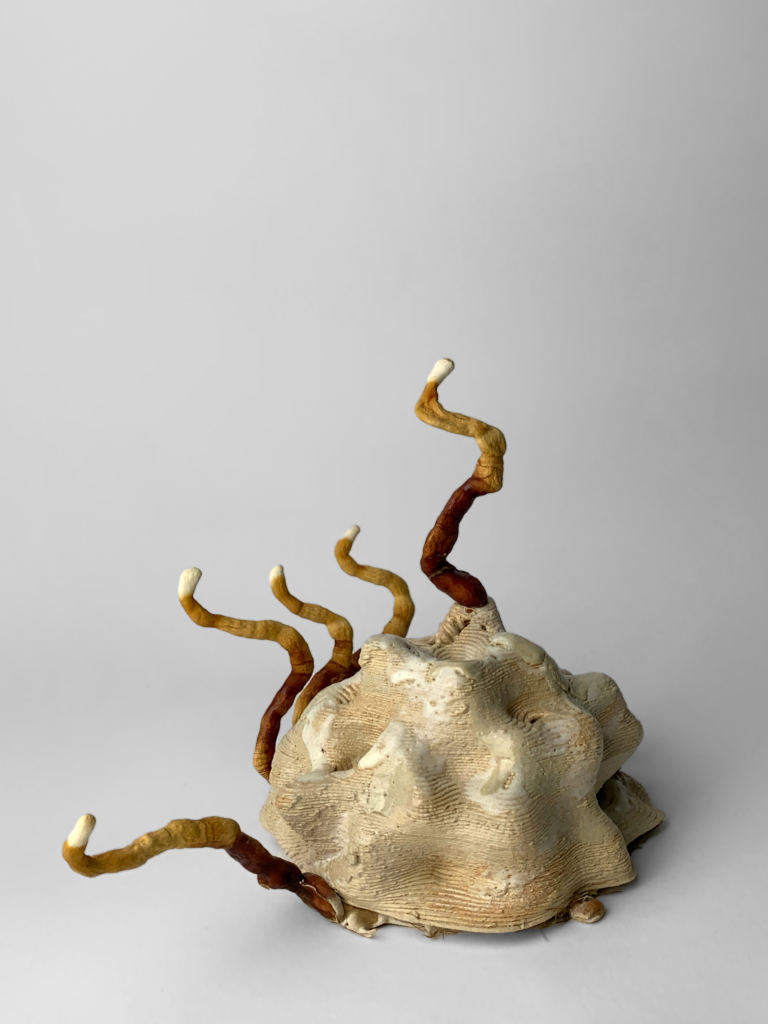 A 3d-printed ceramic sculpture from which Reishi mushrooms grow. The work combines glazed ceramic with living fungi, highlighting the contrast between natural growth and crafted form.